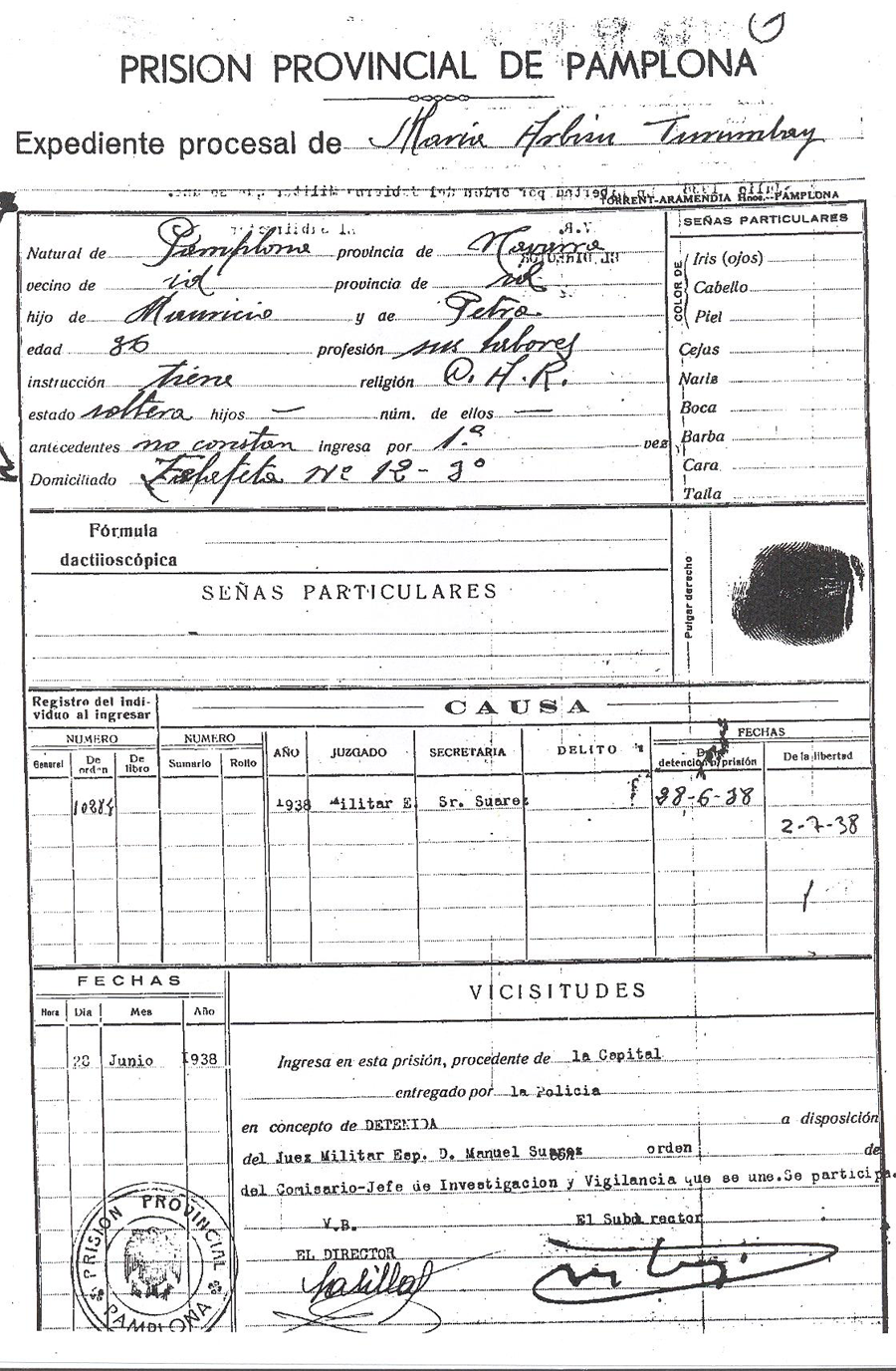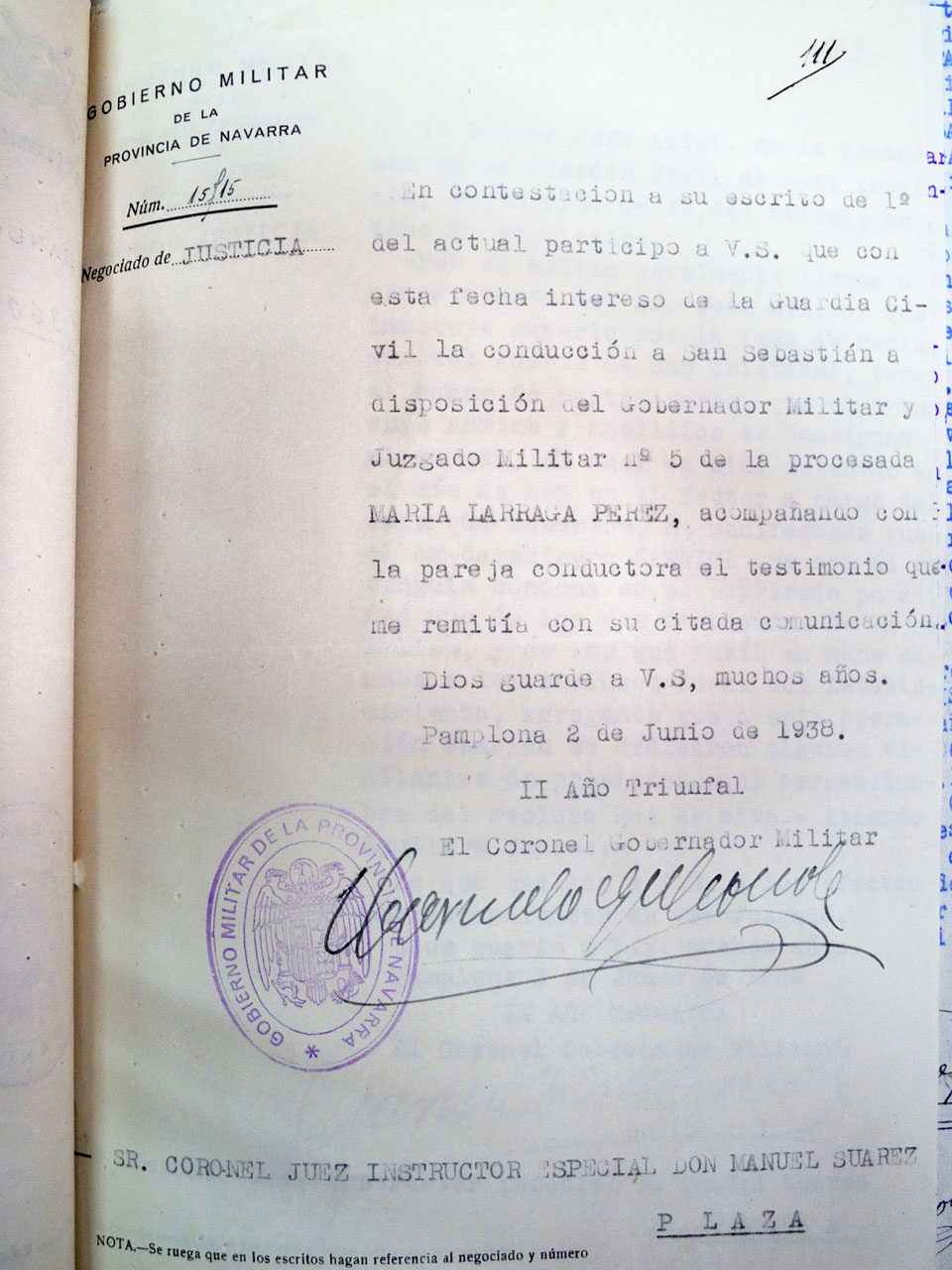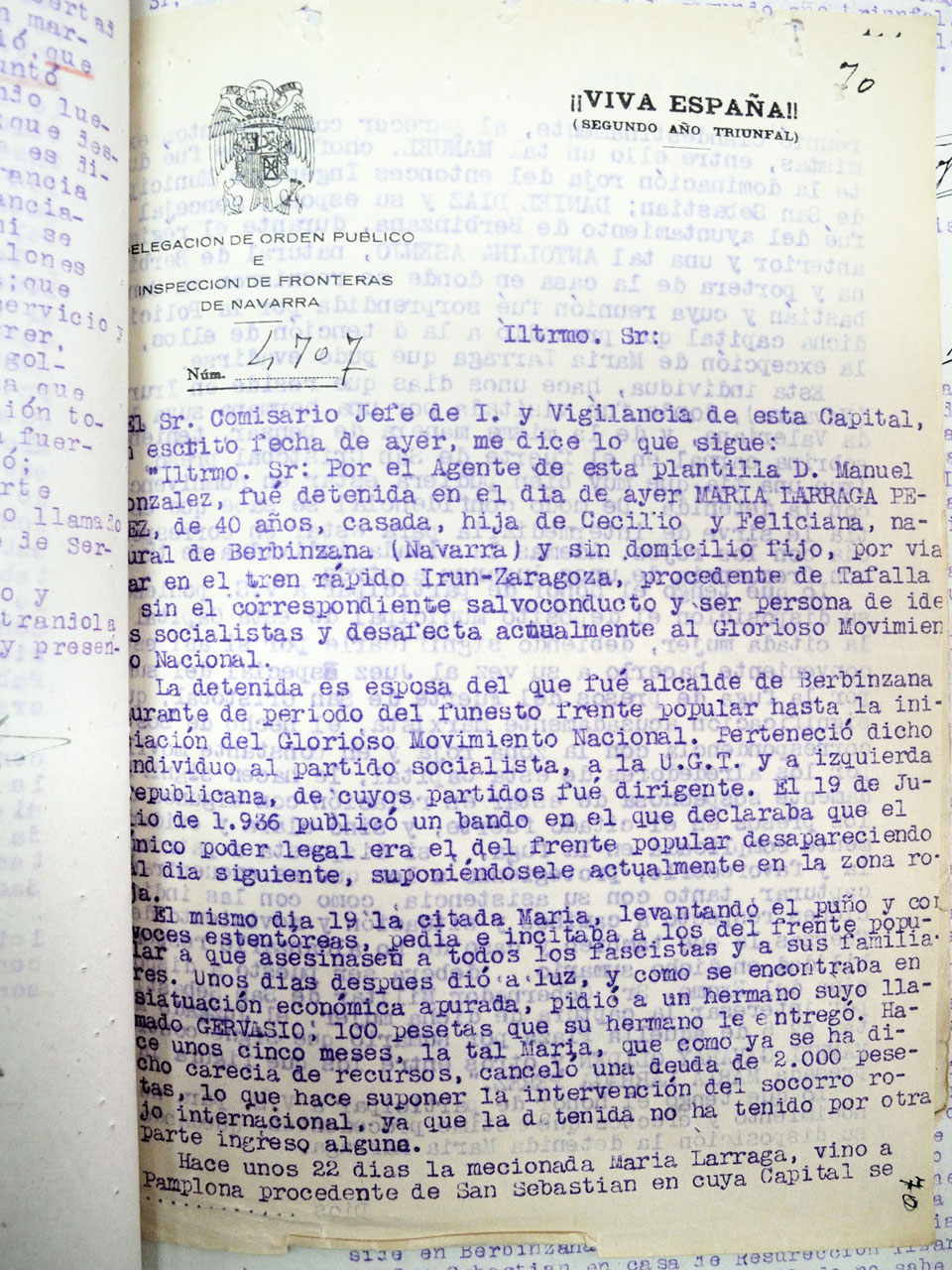 Peor suerte corrió María Larraga. Su marido, Pedro Lacabe, alcalde socialista de Berbinzana, había logrado escapar y encontró refugio en Francia. María, desde el pueblo, visitaba a su sobrino Pablo Asenjo, encarcelado en el fuerte. Los militares encontraron en ella la ansiada conexión entre los encarcelados y los exiliados que supuestamente apoyaban la escapada: “de modo confidencial se sabe que esta tía –Antolína Asenjo– le sirve de intermediaria para estar en correspondencia con los rojos. Además, la citada individua se traslada con frecuencia de unos lugares a otros. Su significación acusadamente marxista, el hecho de sostener correspondencia con la zona roja y en constante movimiento por los alrededores de esta capital le hacen sospechosa de estar en relación con algunos de los presos en el citado fuerte, y si no clara y evidentemente complicada en la fuga, si dispuesta a patrocinarla y favorecerla, protegiendo a los que se encuentran para capturar, tanto con su asistencia, como con las indicaciones respecto a caminos y situación y movimientos de las fuerzas“.[2]