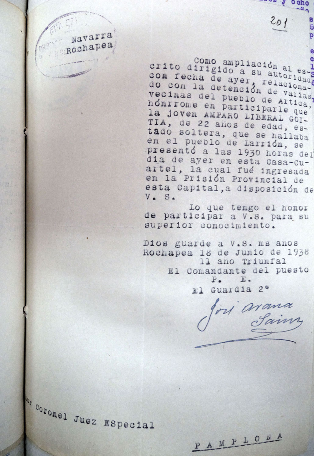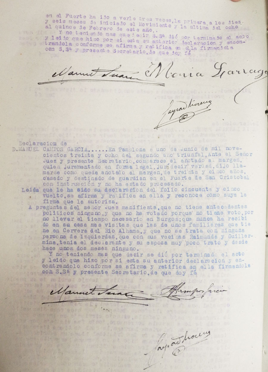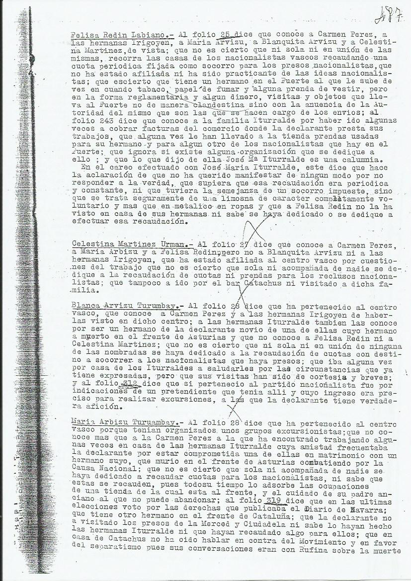 Peor suerte corrió María Larraga. Su marido, Pedro Lacabe, alcalde socialista de Berbinzana, había logrado escapar y encontró refugio en Francia. María, desde el pueblo, visitaba a su sobrino Pablo Asenjo, encarcelado en el fuerte. Los militares encontraron en ella la ansiada conexión entre los encarcelados y los exiliados que supuestamente apoyaban la escapada: “de modo confidencial se sabe que esta tía –Antolína Asenjo– le sirve de intermediaria para estar en correspondencia con los rojos. Además, la citada individua se traslada con frecuencia de unos lugares a otros. Su significación acusadamente marxista, el hecho de sostener correspondencia con la zona roja y en constante movimiento por los alrededores de esta capital le hacen sospechosa de estar en relación con algunos de los presos en el citado fuerte, y si no clara y evidentemente complicada en la fuga, si dispuesta a patrocinarla y favorecerla, protegiendo a los que se encuentran para capturar, tanto con su asistencia, como con las indicaciones respecto a caminos y situación y movimientos de las fuerzas“.[2]