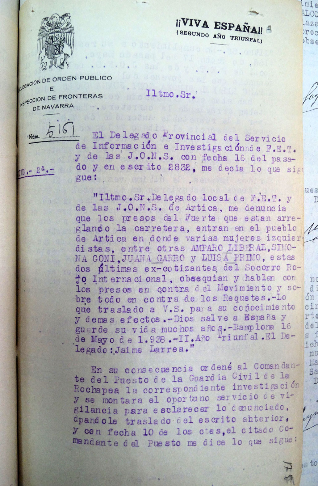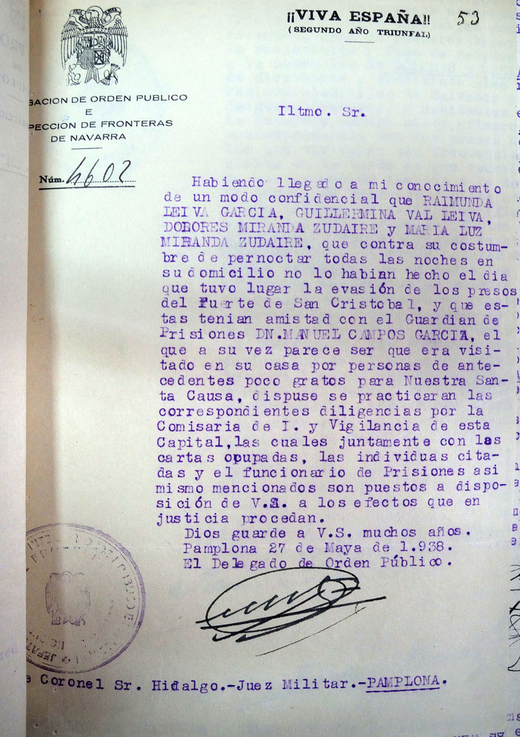 Se registra el domicilio de Marina Zudaire, madre de las hermanas Miranda Zudaire, en busca de pruebas inculpatorias, “por si elementos extraños pudieron haber tenido relación con la fuga de presos del fuerte”. Se incauta a M.ª Luz Miranda una carta de 1935, cuyo remitente, Daniel Morchón estaba preso en la cárcel de Alcalá, y que se despide con un “Salud y Anarquía. Viva la FAI”. En otra misiva exhortaba a Vicente Moriones, preso de CNT en el fuerte, a visitarla cuando saliese. Vicente, cumplida su condena, fue puesto en libertad en la mañana de ese domingo 22 de mayo, encontrándose ambos a las 21:30, como declarará al ser detenida. M.ª Luz había estado en contacto con el activo grupo libertario de Sangüesa, entre ellos, Vicente, Daniel Morchón y José Benedé (ejecutado en el fuerte en noviembre de 1936).