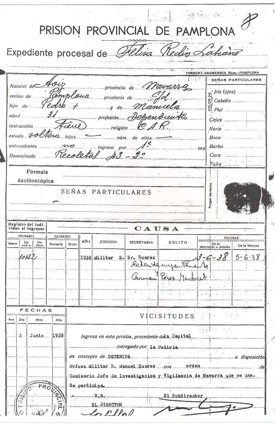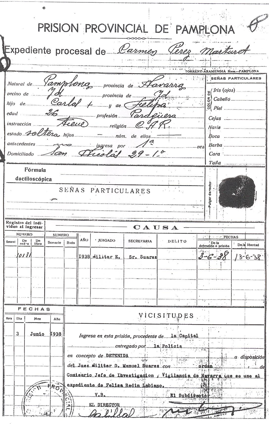 [2] Expediente penitenciario (DGIP). Informe de la Delegación de Orden Público de Navarra e Inspección de Fronteras de 29 de mayo de 1938, previo a su detención el día 31.