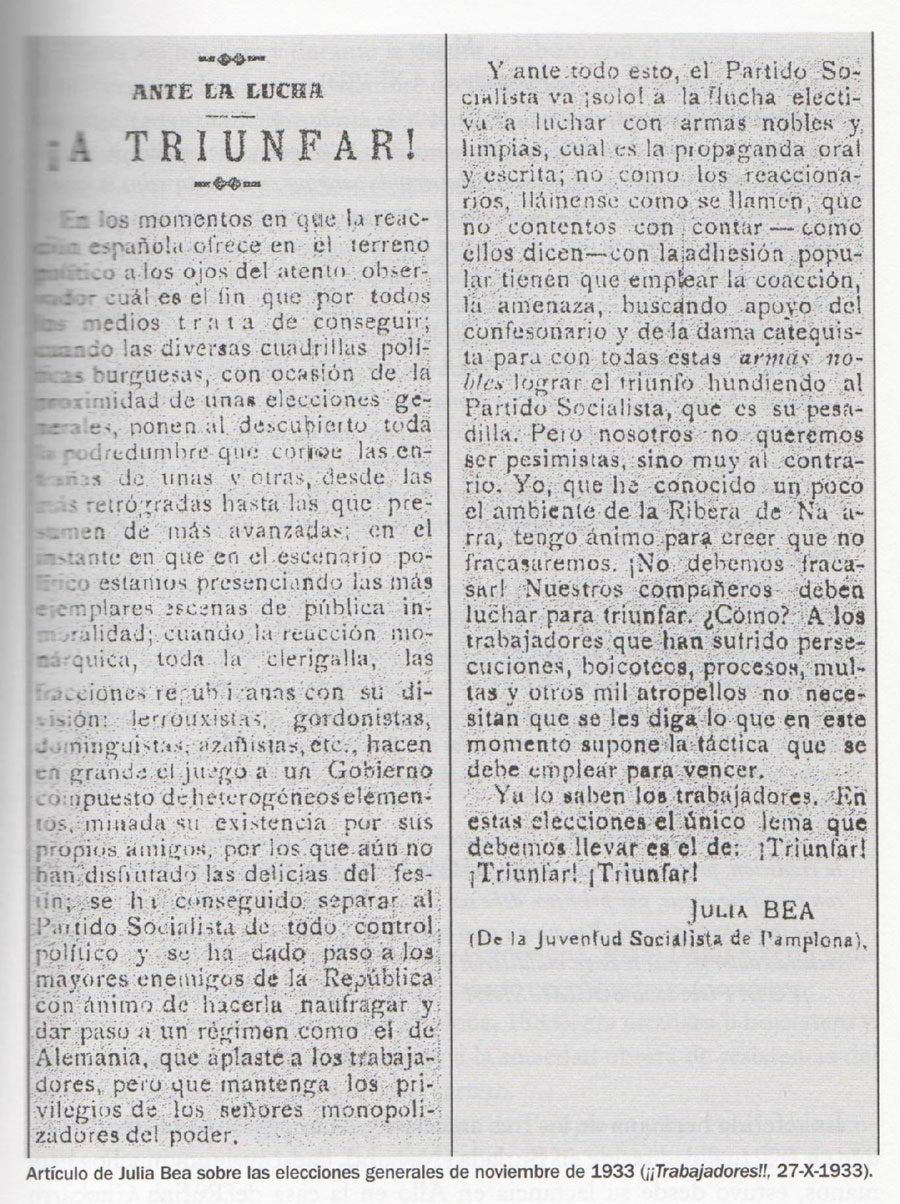 Es Julia Bea Soto, Matilde, quien dirigía el grupo que trata de reconstituir el PCE en Pamplona, cuando Jacinto Ochoa, Felipe Celay y otros son detenidos. Julia es capturada en Valencia al final de la guerra. Escapa y regresa a Pamplona, dedicada a la recomposición del partido. Logra eludir la caída de Jacinto y el resto, pero es detenida en 1943, junto a Dorotea Serrano, Dora. Cumplirán ocho años de cárcel.